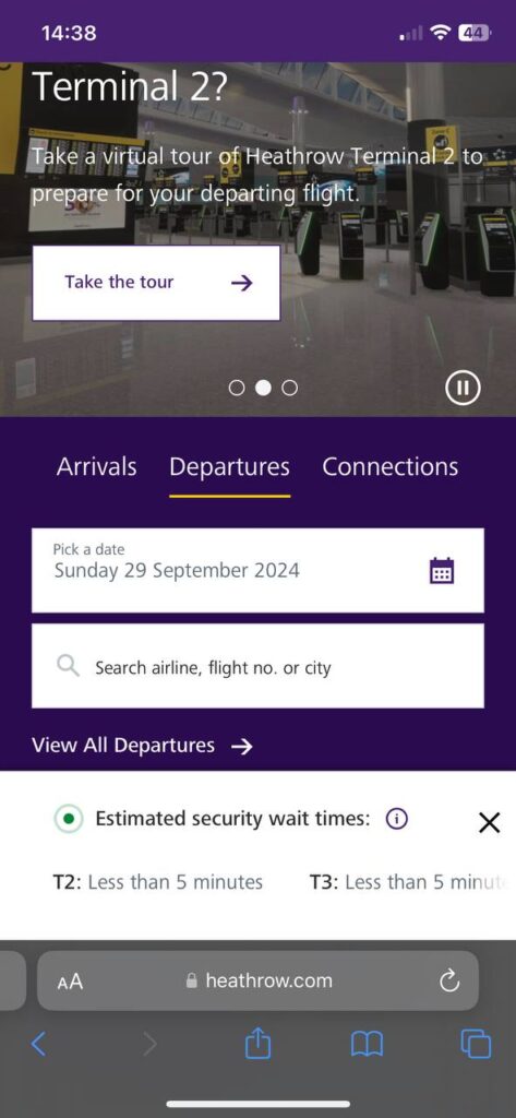 The first thing that caught my attention when I opened the Heathrow Airport website was a white box which is placed on the bottom part and does not vanish when scrolling. This box is designed to give you information about estimated security wait times in different terminals. Having this information is very helpful as a traveler. In addition to thar, you are provided with this chance to choose whether you want to check arrival, departures or connection flights. The key point here is that it doesn’t bombard you with a massive amount of information related to all flights but rather first gives you the opportunity to search a specific date and a flight number, and if you wish to see all flights only then you can easily have access to that by clicking on View All section. Moreover, you this website is all you need for receiving any services that they provide from parking to fast track security. So, you do not need to be directed to any other websites in order to book those services. Last but not least, the virtual tour of the airport that is accessible for all the passengers on the website is going to help you to know where should you go and it prevents the possibility of getting lost and wasting your time.