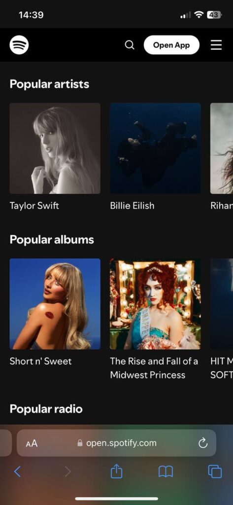 When you open this website you figure out that unlike most of other sites that have a light mode Spotify has a dark mode which is in my opinion the best choice for a music platform. Additionally, unlike the other two websites which I mentioned in my previous posts, the logo is placed on the top left side and the hamburger menu is placed on the top right side. On the first page there are multiple collections from popular artists to popular albums which make it easier for users to find hit songs. The last collection is made up of several pre-made playlists with a wide range of artists and songs. Moreover, one of the best features of this website is that it allows you to listen to a part of the songs that you want to listen without having to sign up or log in into your account. Also, you can be easily directed to the home page by clicking on the logo. Finally, when you wish to only find songs or only artists when you are searching there is a bar right under the search box so you can easily choose a filter and have access to exactly what you want.